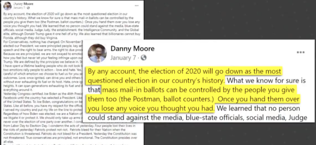 Take a look at this screenshot of one of Moore’s Facebook commentaries on the election (note the date as January 7):