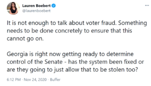 Axing Rep. Cheney in favor of “election truther” Rep. Stefanik is overall a positive development for Colorado’s Rep. Lauren Boebert, who is facing an ethics investigation requested by Rep. Pramila Jayapal over Boebert’s own role in inciting the January 6th insurrection at the U.S. Capitol. But there’s a twist: Stefanik appears to go quite a bit farther in allowing for the possibility of election fraud than Boebert did in her response to Payapal’s ethics complaint, in which Boebert asserts she wasn’t alleging “election fraud” at all: