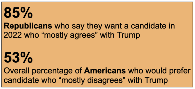 “The numbers fly in the face of any predictions that Donald Trump’s political future is in decline. By a substantial majority, Republicans: (1) believe the election was stolen from him, (2) want Trump to run again, and (3), if they can’t vote for Trump, prefer someone who agrees with him.”