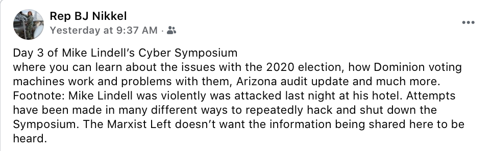 Twitter may have shut down Nikkel’s account when it became too insurrectionist for their terms of service, but apparently Facebook’s standards are lenient enough that Nikkel is allowed to keep her platform there. And checking in last week while “MyPillow” conspiracy guy Mike Lindell’s flop sweat-laden “Cyber Symposium,” which revealed precisely zero promised proof of election fraud last week, we see that Nikkel was cheering on this most epochal of nothingburgers: