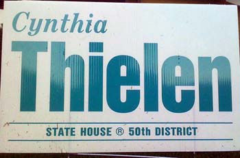 Not a bad sign, though we would make “State House” bigger and get rid of “50th district” (as we’ve explained before, no voters know the number of the district they live in, so there’s no reason to put it on a yard sign). We assume the ‘R’ insignia means that Thielen is a Republican, and not that she trademarked the words “State House,” but that could be more clear as well.