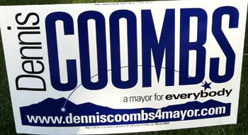 There’s a fatal flaw with this sign: it’s not clear what office Dennis Coombs is seeking. The word “mayor” is in small type smashed into a slogan smushed between his name and the mountain image at the bottom. This is fine for a website or a mailing, but not for a yard sign that people need to be able to read while driving.