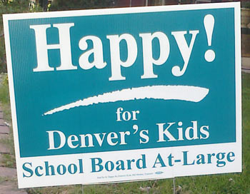 This sign violates one of the fundamental tenets of politics (in our mind, at least): don’t ever assume that voters are familiar with you or the office you are seeking. If you don’t know Happy Haynes from a Happy Meal, then this sign will make absolutely no sense to you. Who is Happy for Denver’s kids? What? It’s like a bad Abbot and Costello routine.