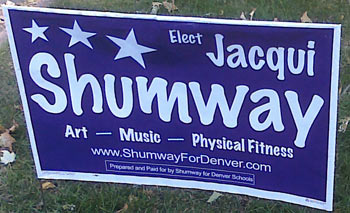 We also dislike the “At-Large” writing on the sign; it doesn’t matter to voters if you are running in a particular district or at-large, because they can only vote for whatever names are on the ballot. Happy would have been better off with just using “Denver School Board.”