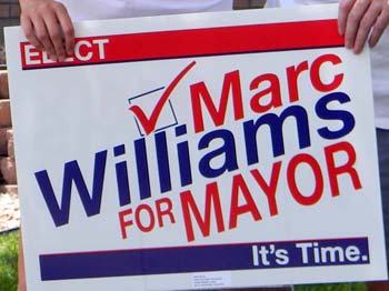 This is a good sign because it’s easy to read, though we’d ditch the “ELECT” on top of the sign — particularly since there is also a checkbox graphic (we’ve never understood why people put “elect” on a sign; the “Marc Williams for Mayor” part is pretty explanatory).