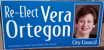 This particular sign is a larger banner, and we don’t know if Ortegon’s yard signs looked the same. But we included this one because of the head shot picture. We’ve never understood putting a head shot on a sign — it’s expensive to include a full-color picture, and we don’t see where it helps you. We suppose you could argue that including a picture makes it more personal, but you also risk turning off voters who don’t like the photo.