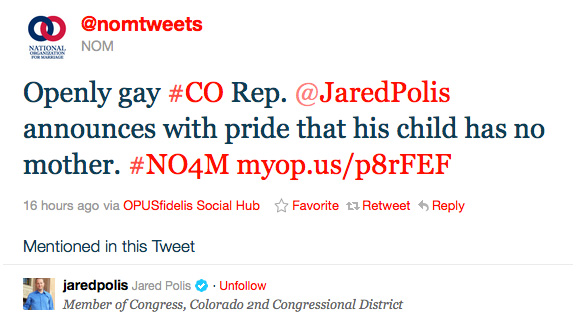 “Pro-family” conservative group National Organization For Marriage welcomes Caspian Julius, son of Rep. Jared Polis and Marlon Reis, into the world via Twitter yesterday.