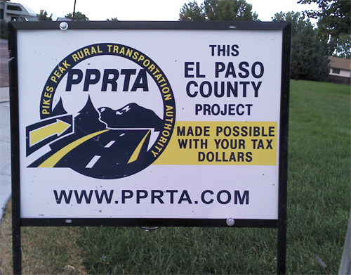 And look! In El Paso County, where the conservative taxpayers are ever skeptical, and always on guard against “waste”–why, they’re using “made possible with your tax dollars” signs! Because the voters and taxpayers in that area need a personal recognition of value, right? A connection between public money and the work done to benefit their community. Right?