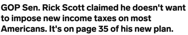 Critics jumped on Scott’s policy proposal, which includes a huge tax increase for all Americans. Scott’s plan is also heavy on affirming strict gender roles and requiring more people to recite “The Pledge of Allegiance,” but it’s the tax increases that are freaking out other Republicans. Via a separate Washington Post story: “It’s dramatically off-message for where Republicans are going on taxes — they shouldn’t be talking about raising taxes on anybody,” said Brian Riedl, a former aide to Sen. Rob Portman (R-Ohio) and a senior fellow at the Manhattan Institute, a center-right think tank.