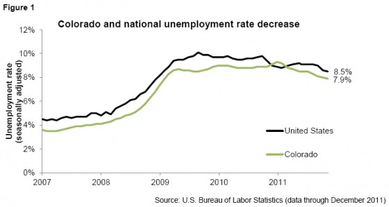 Which shows a very brief period at the beginning of 2011 where Colorado’s unemployment rate exceeded the national average. While the graph is displayed, the narrator voices over: “Here in Colorado, tens of thousands of jobs have been lost since Obama took office.”