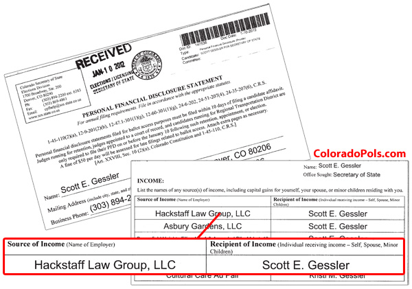 The excerpt above is from Gessler’s 2011 personal financial disclosure statement. The top-listed item under Gessler’s list of external personal income is money paid to him, an unknown amount and for an unknown purpose but sometime within the 2011 calendar year, by the very same Hackstaff Law Group he was going to moonlight for! After the ruckus caused by Gessler’s attempt do do side work for his old firm, it should be clear why this annual disclosure is mandatory from incumbent officeholders: so the public can see if there is a problem.