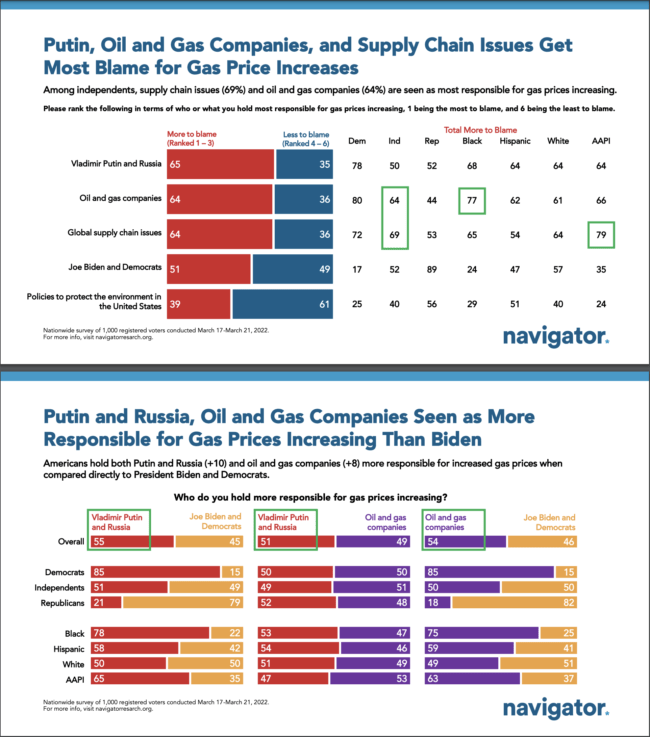 It was interesting to see, then, that new polling data seems to indicate that a majority of Americans actually understand that rising gasoline prices have nothing to do with partisan politics. Take a look at these charts from Navigator Research showing that Americans see the real culprits as 1) Vladimir Putin and Russia, and 2) Oil and gas companies: