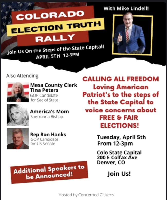 One week from tomorrow the loudest election conspiracy theorist in America “MyPillow Guy” Mike Lindell will be in Colorado to headline a rally for his dear friend and recipient of much Big Pillow largesse, indicted but still-in-it-to-win-it Secretary of State candidate Tina Peters. Also headlining is the Colorado GOP U.S. Senate primary’s leading “election truther” Ron Hanks–potentially delivering a big boost for both candidates with Republican party faithful ahead of the crucial GOP state assembly the following weekend. While some local Republicans are calling, in a few cases pleading for the party to move on from Donald Trump and focus on gains in the upcoming midterms, a majority of Republicans according to polls are still not ready to do that. This rally is for them, and if you think it’s crazy then this rally is simply not for you.