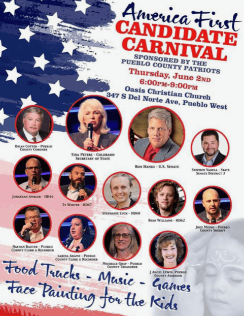We don’t know what Brian Cotter, who is apparently the Pueblo Patriots’ favored candidate for Pueblo County Coroner, did to get himself on the top tier of candidates along with Tina Peters and Ron Hanks, but the possibilities are creeping us out. Also curious is Stephen Varela, running for Leroy Garcia’s old Senate seat, sharing top billing with Hanks and Peters. SD-3 is on the list of Senate seats Republicans would like to pick up in November, and Varela has been pitched by Republicans as a curveball in this politically volatile district.