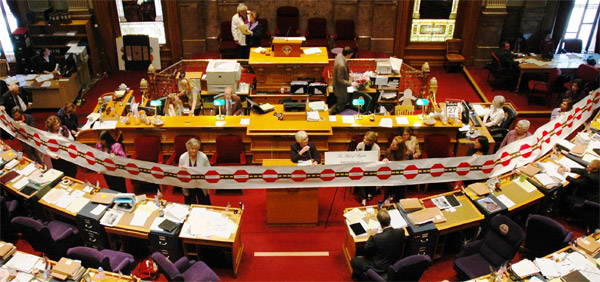 Republicans were furious that Democratic women unfurled a banner in front of the podium spanning nearly the length of the Senate chamber showing several stop signs to indicate instances in which birth control could be denied. The symbolic measure has no chance of passing the Democratic-controlled Senate but was surprisingly let out of committee.