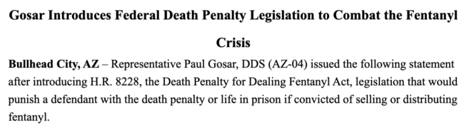 ► The Pro Life Party strikes again. Here’s a press release from Arizona Republican Congressman Paul Gosar with a totally-reasonable 🙄 policy suggestion: