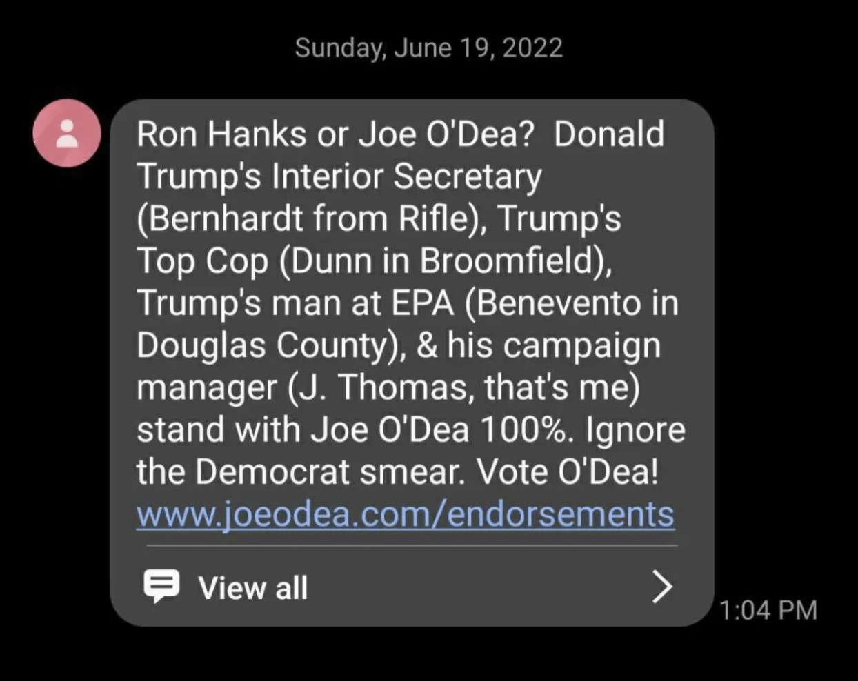 Just before the June 28th primary, O’Dea’s campaign sent this text message to Republican primary voters, touting the support he enjoyed from numerous Trump administration officials with local ties like former Interior Secretary David Bernhardt: