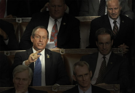 And so I saw Joe Wilson lean forward, (laughter) and I saw him raise his finger up, and then he goes, ‘you lie! You lie!’ And I’m thinking, “wow, this is going to be a story tomorrow.” (laughter) So then, we’ve got to get up, afterwards, and we’re kind of giving our ceremonial applause, and I look down and Joe Wilson’s gone. But Rahm Emanuel, the president’s chief of staff is making a bee line right to me, looking for Joe Wilson. Just red as could be, swearing at everybody that was in his way. And, uh, Joe Wilson had left, and I looked and he was gone.