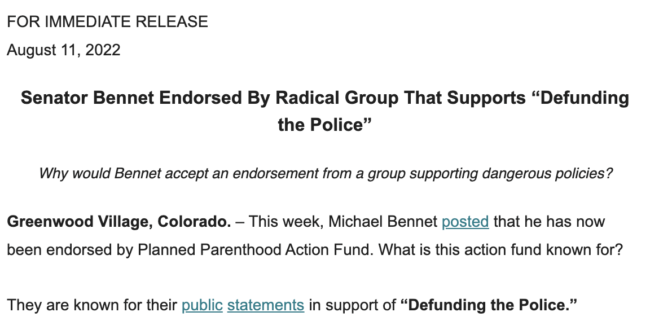 The Colorado GOP is attacking Bennet’s endorsement from Planned Parenthood Action Fund by claiming that the group is “known for their public statements in support of ‘Defunding the Police.'”