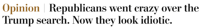 Among Trump’s many claims/excuses related to the FBI search of Mar-a-Lago on Monday were that his attorneys were not allowed to be present at the time of the search; the fact that one of his attorneys SIGNED THE PROPERTY RECEIPTS makes this argument considerably less useful.