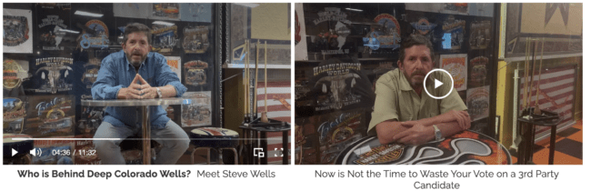 Wells operates an independent expenditure committee (IEC) called Deep Colorado Wells. The IEC has its own website that is mostly filled with long, strange video rants from Wells himself, in which he sits at a table in a game room of some sort and yells at rhetorical clouds facing a camera that apparently does not include an external microphone.