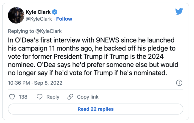 Later in August, O’Dea would say publicly — TWICE — that the raid on Mar-a-Lago was a “political stunt.” As more information emerged about the reasoning behind the Mar-a-Lago raid, O’Dea’s comments began to look increasingly terrible. Let the backtracking begin (again)!