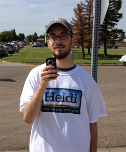 The next day — Friday, June 22nd — the same young man showed up at the Heitkamp campaign headquarters in Mandan, North Dakota, and asked if anyone was making volunteer calls. He apparently wanted to volunteer to make calls. No calls were being made that day, so he left. On Saturday, June 23rd, the same young man showed up at the parade in Beulah, North Dakota, (pop. 2,900). Beulah is about 80 or 90 minutes north and west of Bismarck. The young man asked to get a volunteer t-shirt and was given one. He put it on. He was asked whether he would sign up to volunteer for the campaign and declined. At about that point, this young man pulled a “flip-cam” out of his pocket, turned it on, and he got all up in Heidi Heitkamp’s grill, asking her questions. I don’t know what the questions were, but — based upon what I’ve been told — they were pretty much the sorts of typical right-wing garbage you’d expect to get from a script prepared for a fake attack “journalist” like Shawn Hannity or Bill O’Reilly. I’m sure you’ll be watching the video some time soon.
