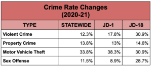 For a different comparison, let’s examine crime rates in JD-1 (Jefferson, Gilpin) compared to JD-18. Both districts are in the Denver Metro area, and both have new District Attorneys who started their jobs in 2021.