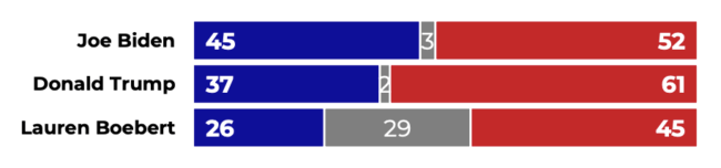Two years after Boebert was first elected to Congress, it’s worth taking a look at why she is still the face of the Colorado Republican Party. Boebert is incredibly unpopular statewide; the latest polling numbers from “The Rocky Mountaineer” show that her approval ratings in Colorado are 19 points underwater (26% “favorable” vs. 45% “unfavorable”). More Coloradans believe in UFOs than Boebert.