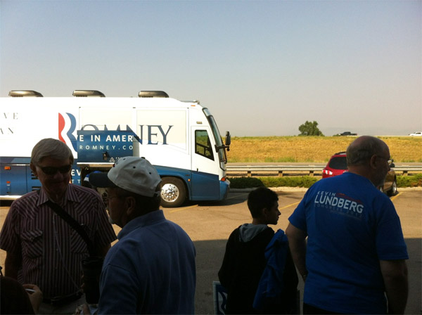 We’ll update as press coverage comes in throughout the day. Sources report about 60 people total at the Mitt Romney campaign’s event in Johnson’s Corner, about 20-25 of whom were staffers and another half-dozen or so press. GOP luminaries in attendance, in addition to Sen. Rob Portman of Ohio, included Rep. Cory Gardner, Colorado GOP chairman Ryan Call–and interestingly, as you can see in the photo above, longshot CD-2 candidate Kevin Lundberg’s campaign was in full force. We haven’t seen any pictures of the always-entertaining Lundberg with somebody consequential like Sen. Portman, but that would be a great posterity photo.