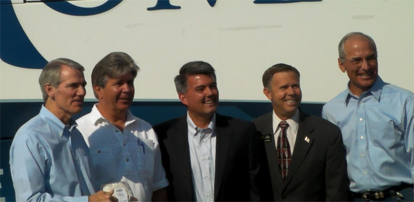 At today’s Romney campaign event at Johnson’s Corner. From left: Sen. Rob Portman (R-Ohio), Loveland city councilman Chauncey Taylor, Rep. Cory Gardner, GOP CD-2 nominee Kevin Lundberg, former Rep. Bob Beauprez. Anonymous photo