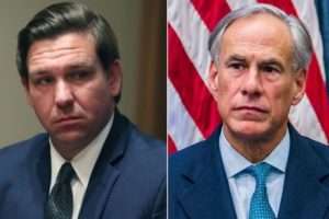 Florida Gov. Ron DeSantis and Texas Gov. Greg Abbott, chief players of the GOP migrant trafficking game.