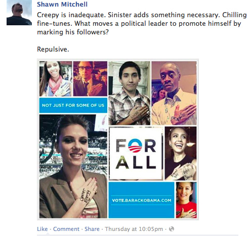 So, if you look closely, all of the people in this Barack Obama campaign web ad have various issue goals written in marker on their hands. “Cleaner Energy,” “Equal Pay,” “Gender Equality,” and so forth. Apparently the Obama campaign asked supporters to write messages on their hands and post photos of their hands over their hearts. Celebrities like Natalie Portman, Scarlett Johansson, and Jessica Alba, all well-known Obama supporters, did so.