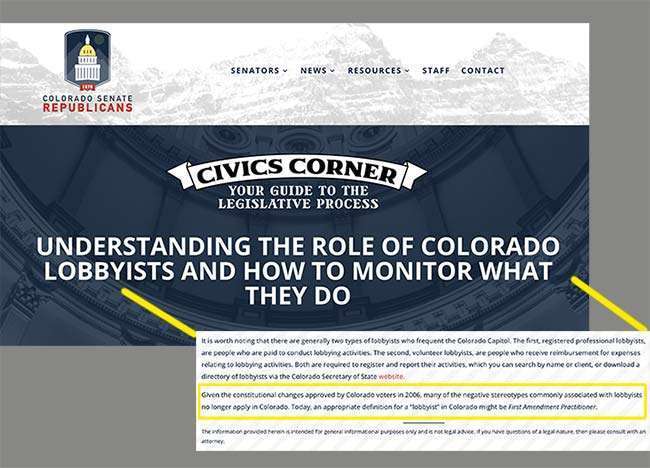 The website for the Colorado Senate Republicans includes a section called “Civics Corner,” which is explained as “Your guide to the legislative process.” Included in this corner of the Senate GOP website is a guide to “Understanding the role of Colorado lobbyists and how to monitor what they do.” The explanation mainly deals with an outline of the voter-approved measure in 2006 called “Amendment 41” that implemented lobbying reforms; stronger ethics measures; and a “gift ban” for lawmakers.