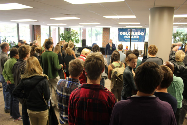 On Saturday, the Obama RV tour was headlined by Sen. Mark Udall, with stops in Pueblo and Colorado College in Colorado Springs (see photos above), then on to the Denver area where former Gov. Roy Romer reportedly spoke. Today, fully eight stops are scheduled throughout the Denver metro area, featuring Gov. John Hickenlooper, Denver Mayor Michael Hancock, Rep. Diana DeGette, and former Mayor Wellington Webb among many others.