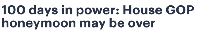 “Compared to other Congresses of divided nature as we have right now, it’s about on par, especially in this polarized era where it’s tough to get agreement,” said Casey Burgat, director of the Legislative Affairs program at the Graduate School of Political Management at George Washington University. “But strictly speaking, judging by what they promised their constituents once they got the gavel and sending forward, they’ve lacked a little muster there.” [Pols emphasis]