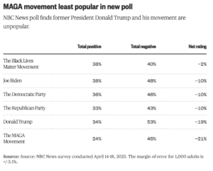 This should be a concern for Republicans for a number of reasons, not the least of which is the disdain that Americans currently hold for whomever captures the hearts of the MAGA Republican base. As NBC News reports, both Trump and his “Make America Great Again” movement are wildly unpopular: