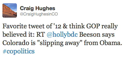 It’s also worth noting, as Hughes did, that longtime local GOP operative Rich Beeson was Romney’s political director. Beeson’s willing participation in the groupthink and flawed assumptions that led the Romney campaign to believe Colorado was in their column shows the extent of the break with a reality they should have seen coming at them like a Mack truck.