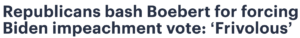 The “impeachment binge” kicked off after the Juneteenth holiday. Boebert had finally learned how to spell “impeach” and was excited to put her words into action, so she rose on the House Floor to seek a parliamentary maneuver to force a vote (within 48 hours) on the question of “Impeaching Joseph R. Biden Jr., president of the United States, for high crimes and misdemeanors.” As Milbank notes, Boebert wanted to skip past all of the discussion and go straight to a vote on her second Biden impeachment effort in as many years: