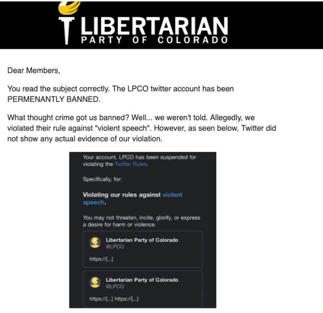 ► One of the recent “projects” for State Republican Party Chair Dave Williams has been an attempt to broker some sort of deal with the Colorado Libertarian Party in order to avoid potential “spoiler” candidates for the GOP (though Williams is also using this theoretical alliance to threaten other Republicans). The Colorado Libertarian Party has its own problems, however, including a recent ban from Twitter: