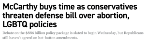…McCarthy and conservative dissidents are in a tug-of-war over how many tough votes to take on amendments. The GOP’s right flank wants to include contentious issues such as Pentagon abortion policies, medical care for transgender troops and diversity programs.