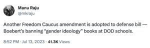 My colleagues on the other side of the aisle will mischaracterize this amendment as extreme. All the while, the Biden administration has spent the last two years promoting radical gender ideology to impressionable young children in K-12 schools throughout our country, including our military schools. Now THAT’S extreme…