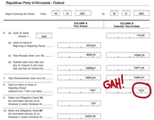♦ We know that the Colorado Republican Party has been struggling to raise money, but at least things aren’t as bad here as they are for the Minnesota Republican Party…which has less than $54 in the bank.