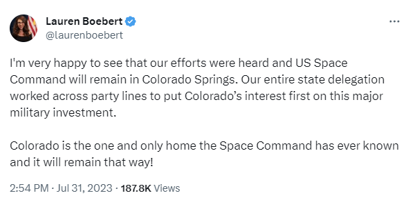 Following the announcement yesterday afternoon that the U.S. Space Command headquarters will not relocate to Alabama from Colorado Springs after two years of politically-motivated uncertainty manufactured by former President Donald Trump, Trump’s most indefatigable diehard supporter in the state’s congressional delegation Rep. Lauren Boebert praised President Joe Biden’s decision to reverse Trump’s last-minute act of treachery against the state…without mentioning either President’s name: