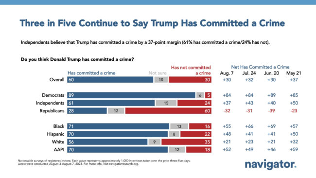 Perhaps most concerning for Trump defenders is that “Independent” voters overwhelmingly believe that Trump “has committed a crime”: