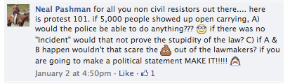 WEDNESDAY UPDATE: Today’s pro-gun rally didn’t live up to the intimidating Facebook bluster, but there were nonetheless a few striking moments, as forwarded to us: