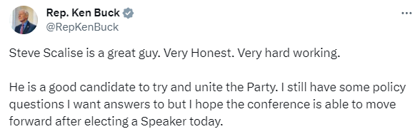Following yesterday’s House GOP “candidate forum” featuring two contenders to replace ousted former Speaker of the House Kevin McCarthy, Rep. Ken Buck of Colorado refused to support either Steve Scalise or Jim Jordan due to their inability in Buck’s view to clearly state for the record that Joe Biden was the rightful winner of the 2020 presidential election.