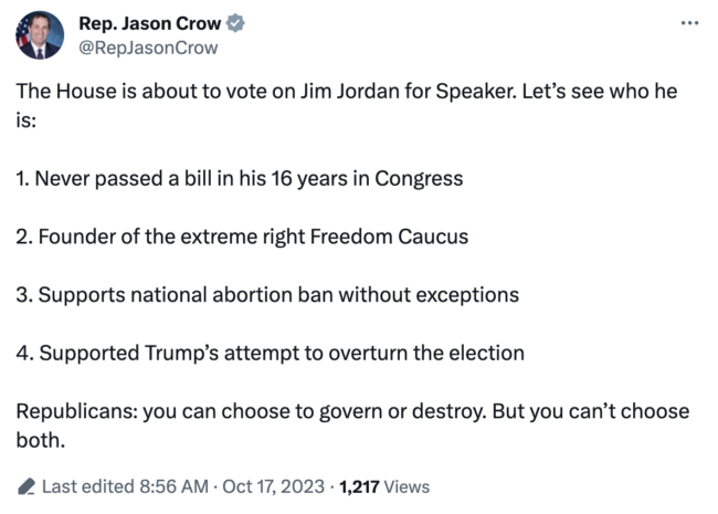 But as many others have pointed out, including Colorado Rep. Jason Crow (D-Aurora), the only thing worse than not having a House Speaker might be giving Jim Jordan the gavel: