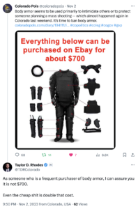UPDATE (FRIDAY): The executive director of the “no compromise” gun fetish rights group Rocky Mountain Gun Owners (RMGO) took issue with the cost of body armor that we found online. If there is a point to this argument from Taylor Rhodes, we must have missed it: