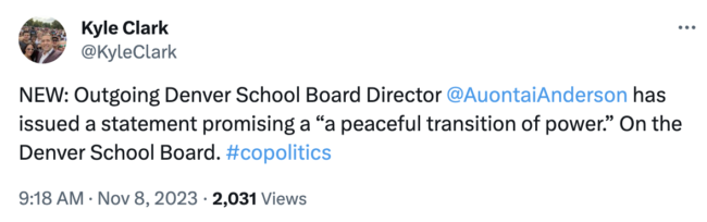 Yesterday, the voters of Denver charted a new course for Denver Public Schools by electing John Youngquist, Kimberlee Sia, and Marlene De La Rosa. I extend my heartfelt congratulations on their decisive victories and am committed to facilitating a seamless transition onto the Denver School Board. I have invited Director-Elect Youngquist to join me at Denver Public Schools next week to commence a peaceful transition of power. [Pols emphasis]